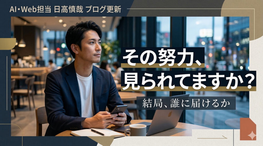 WBC「ネトフリ解約」トレンドから、見てもらえる場所と届け方が肝心 2026.03.17 伝え方 WBC「ネトフリ解約」トレンドから、見てもらえる場所と届け方… 伝え方 | 2026.03.17 信用が深ければ数十万円の商談も即決だった話 2026.03.16 集客 信用が深ければ数十万円の商談も即決だった話 集客 | 2026.03.16 画面を見て自動操作!?僕の仕事が激変した話 2026.03.15 AIサービス 画面を見て自動操作!?僕の仕事が激変した話 AIサービス | 2026.03.15 AIはもうツールじゃない!「雇う」時代が来た 2026.03.14 AIについて AIはもうツールじゃない!「雇う」時代が来た AIについて | 2026.03.14 AIは知識、人間は知恵。動いて得た経験が最強武器 2026.03.13 AIについて AIは知識、人間は知恵。動いて得た経験が最強武器 AIについて | 2026.03.13 AI時代の仕事。僕の仕事はひたすら「Yes」を答えるだけ? 2026.03.12 AIについて思うこと AI時代の仕事。僕の仕事はひたすら「Yes」を答えるだけ? AIについて思うこと | 2026.03.12 そりゃあ失敗するよ。人間だもの 2026.03.11 日常で感じたこと そりゃあ失敗するよ。人間だもの 日常で感じたこと | 2026.03.11 ほんとにそれは寄り添っているのだろうか? 2026.03.10 AIについて思うこと ほんとにそれは寄り添っているのだろうか? AIについて思うこと | 2026.03.10 人が言ったから?それ、自分の軸がブレてる証拠 2026.03.09 日常で感じたこと 人が言ったから?それ、自分の軸がブレてる証拠 日常で感じたこと | 2026.03.09 AIにタイトルお願いするなら!「なんか違う」を卒業するコツ 2026.03.08 AIの使い方 AIにタイトルお願いするなら!「なんか違う」を卒業するコツ AIの使い方 | 2026.03.08 カメラのレンタルで確信。指示待ち社員より「外注」が最強な理由 2026.03.07 日常で感じたこと カメラのレンタルで確信。指示待ち社員より「外注」が最強な理由 日常で感じたこと | 2026.03.07 Geminiさんと仲直り?AI選びは結局「会社の思想」で決めるのが正解説 2026.03.06 AIについて思うこと Geminiさんと仲直り?AI選びは結局「会社の思想」で決め… AIについて思うこと | 2026.03.06 顔の浮かばない言葉は、届かない 2026.03.05 ブログ 顔の浮かばない言葉は、届かない ブログ | 2026.03.05 僕に必要なのはAIのスキルではなく人間としてのスキルでした! 2026.03.04 AIについて思うこと 僕に必要なのはAIのスキルではなく人間としてのスキルでした! AIについて思うこと | 2026.03.04 嘘か真実か、見分けがつかない時代。最後に信じられるのは「誰が発信している… 2026.03.03 AIについて思うこと 嘘か真実か、見分けがつかない時代。最後に信じられるのは「誰が… AIについて思うこと | 2026.03.03 当たり前は意外と伝わらない!発信し続けることの価値 2026.03.02 ブログ 当たり前は意外と伝わらない!発信し続けることの価値 ブログ | 2026.03.02 ClaudeのAnthropicが大ピンチ!OpenAIが美味しいところ… 2026.03.01 AIについて ClaudeのAnthropicが大ピンチ!OpenAIが美… AIについて | 2026.03.01 営業の提案で実感。やっぱり「想像」が売上を分けるんだな 2026.02.28 日常で感じたこと 営業の提案で実感。やっぱり「想像」が売上を分けるんだな 日常で感じたこと | 2026.02.28 AIに頼りすぎは要注意。中身スカスカは自分もスカスカに見られる 2026.02.27 AIについて思うこと AIに頼りすぎは要注意。中身スカスカは自分もスカスカに見られ… AIについて思うこと | 2026.02.27 AIに丸投げして、自分の記憶を失う 2026.02.26 AIについて思うこと AIに丸投げして、自分の記憶を失う AIについて思うこと | 2026.02.26 「ブログ書いててよかった!」と心から言える。AI時代に「体験」が最強な理… 2026.02.25 ブログ 「ブログ書いててよかった!」と心から言える。AI時代に「体験… ブログ | 2026.02.25 あれのスランプです。この時何を考える!? 2026.02.24 ブログ あれのスランプです。この時何を考える!? ブログ | 2026.02.24 サム・アルトマンが語るAI超知能!2028年までに人類超えるってよ 2026.02.23 AIについて サム・アルトマンが語るAI超知能!2028年までに人類超える… AIについて | 2026.02.23 AIで仕事が減るは嘘!実は業務は増えている 2026.02.22 AIについて思うこと AIで仕事が減るは嘘!実は業務は増えている AIについて思うこと | 2026.02.22 AIを導入するためのプレゼン!活用はアイデア出しから始める 2026.02.21 AIについて思うこと AIを導入するためのプレゼン!活用はアイデア出しから始める AIについて思うこと | 2026.02.21 AIを遊び倒せ!ジェームス・スキナーが語る使わないと損な未来 2026.02.20 AIについて思うこと AIを遊び倒せ!ジェームス・スキナーが語る使わないと損な未来 AIについて思うこと | 2026.02.20 結局、AI時代も「体験」がすべてを変える 2026.02.19 AIについて思うこと 結局、AI時代も「体験」がすべてを変える AIについて思うこと | 2026.02.19 反省してるふりは不要。変えるべきは「心」より「仕組み」だった。 2026.02.18 日常で感じたこと 反省してるふりは不要。変えるべきは「心」より「仕組み」だった… 日常で感じたこと | 2026.02.18 発信内容の「賞味期限」が切れていた話 2026.02.17 AIについて思うこと 