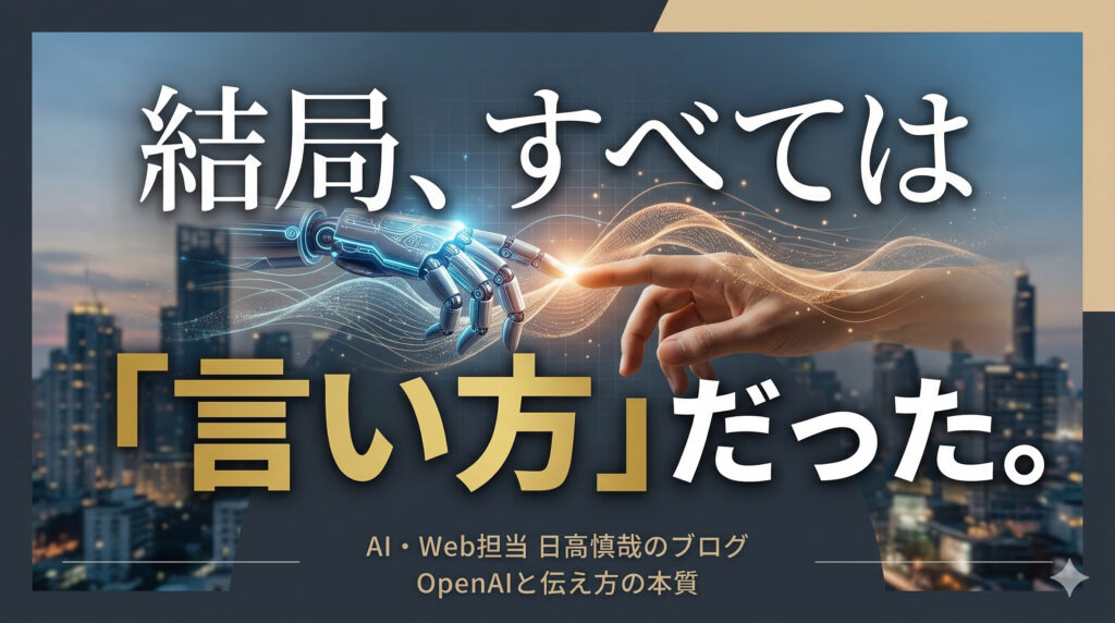 広島城で気づいた行動のきっかけ、人は「今」動く理由を探してる 2026.03.21 集客 広島城で気づいた行動のきっかけ、人は「今」動く理由を探してる 集客 | 2026.03.21 OpenAIの有料化の話、最終的に大事なのは伝え方 2026.03.20 AIについて思うこと OpenAIの有料化の話、最終的に大事なのは伝え方 AIについて思うこと | 2026.03.20 ナビを信じてみたけど、直感に従わなかったら後悔した 2026.03.19 日常で感じたこと ナビを信じてみたけど、直感に従わなかったら後悔した 日常で感じたこと | 2026.03.19 AIがブログ書いてくれるからわざわざ自分で書かなくてもよくない? 2026.03.18 ブログ AIがブログ書いてくれるからわざわざ自分で書かなくてもよくな… ブログ | 2026.03.18 WBC「ネトフリ解約」トレンドから、見てもらえる場所と届け方が肝心 2026.03.17 伝え方 WBC「ネトフリ解約」トレンドから、見てもらえる場所と届け方… 伝え方 | 2026.03.17 信用が深ければ数十万円の商談も即決だった話 2026.03.16 集客 信用が深ければ数十万円の商談も即決だった話 集客 | 2026.03.16 画面を見て自動操作!?僕の仕事が激変した話 2026.03.15 AIサービス 画面を見て自動操作!?僕の仕事が激変した話 AIサービス | 2026.03.15 AIはもうツールじゃない!「雇う」時代が来た 2026.03.14 AIについて AIはもうツールじゃない!「雇う」時代が来た AIについて | 2026.03.14 AIは知識、人間は知恵。動いて得た経験が最強武器 2026.03.13 AIについて AIは知識、人間は知恵。動いて得た経験が最強武器 AIについて | 2026.03.13 AI時代の仕事。僕の仕事はひたすら「Yes」を答えるだけ? 2026.03.12 AIについて思うこと AI時代の仕事。僕の仕事はひたすら「Yes」を答えるだけ? AIについて思うこと | 2026.03.12 そりゃあ失敗するよ。人間だもの 2026.03.11 日常で感じたこと そりゃあ失敗するよ。人間だもの 日常で感じたこと | 2026.03.11 ほんとにそれは寄り添っているのだろうか? 2026.03.10 AIについて思うこと ほんとにそれは寄り添っているのだろうか? AIについて思うこと | 2026.03.10 人が言ったから?それ、自分の軸がブレてる証拠 2026.03.09 日常で感じたこと 人が言ったから?それ、自分の軸がブレてる証拠 日常で感じたこと | 2026.03.09 AIにタイトルお願いするなら!「なんか違う」を卒業するコツ 2026.03.08 AIの使い方 AIにタイトルお願いするなら!「なんか違う」を卒業するコツ AIの使い方 | 2026.03.08 カメラのレンタルで確信。指示待ち社員より「外注」が最強な理由 2026.03.07 日常で感じたこと カメラのレンタルで確信。指示待ち社員より「外注」が最強な理由 日常で感じたこと | 2026.03.07 Geminiさんと仲直り?AI選びは結局「会社の思想」で決めるのが正解説 2026.03.06 AIについて思うこと Geminiさんと仲直り?AI選びは結局「会社の思想」で決め… AIについて思うこと | 2026.03.06 顔の浮かばない言葉は、届かない 2026.03.05 ブログ 顔の浮かばない言葉は、届かない ブログ | 2026.03.05 僕に必要なのはAIのスキルではなく人間としてのスキルでした! 2026.03.04 AIについて思うこと 僕に必要なのはAIのスキルではなく人間としてのスキルでした! AIについて思うこと | 2026.03.04 嘘か真実か、見分けがつかない時代。最後に信じられるのは「誰が発信している… 2026.03.03 AIについて思うこと 嘘か真実か、見分けがつかない時代。最後に信じられるのは「誰が… AIについて思うこと | 2026.03.03 当たり前は意外と伝わらない!発信し続けることの価値 2026.03.02 ブログ 当たり前は意外と伝わらない!発信し続けることの価値 ブログ | 2026.03.02 ClaudeのAnthropicが大ピンチ!OpenAIが美味しいところ… 2026.03.01 AIについて ClaudeのAnthropicが大ピンチ!OpenAIが美… AIについて | 2026.03.01 営業の提案で実感。やっぱり「想像」が売上を分けるんだな 2026.02.28 日常で感じたこと 営業の提案で実感。やっぱり「想像」が売上を分けるんだな 日常で感じたこと | 2026.02.28 AIに頼りすぎは要注意。中身スカスカは自分もスカスカに見られる 2026.02.27 AIについて思うこと AIに頼りすぎは要注意。中身スカスカは自分もスカスカに見られ… AIについて思うこと | 2026.02.27 AIに丸投げして、自分の記憶を失う 2026.02.26 AIについて思うこと AIに丸投げして、自分の記憶を失う AIについて思うこと | 2026.02.26 「ブログ書いててよかった!」と心から言える。AI時代に「体験」が最強な理… 2026.02.25 ブログ 「ブログ書いててよかった!」と心から言える。AI時代に「体験… ブログ | 2026.02.25 あれのスランプです。この時何を考える!? 2026.02.24 ブログ あれのスランプです。この時何を考える!? ブログ | 2026.02.24 サム・アルトマンが語るAI超知能!2028年までに人類超えるってよ 2026.02.23 AIについて サム・アルトマンが語るAI超知能!2028年までに人類超える… AIについて | 2026.02.23 AIで仕事が減るは嘘!実は業務は増えている 2026.02.22 AIについて思うこと AIで仕事が減るは嘘!実は業務は増えている AIについて思うこと | 2026.02.22 AIを導入するためのプレゼン!活用はアイデア出しから始める 2026.02.21 AIについて思うこと AIを導入するためのプレゼン!活