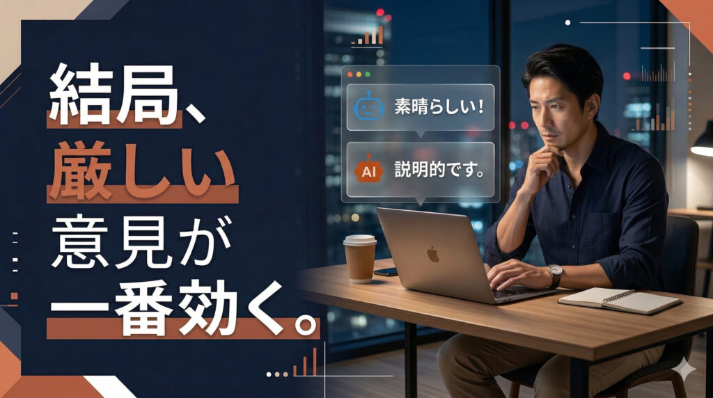 人が言ったから?それ、自分の軸がブレてる証拠 2026.03.09 日常で感じたこと 人が言ったから?それ、自分の軸がブレてる証拠 日常で感じたこと | 2026.03.09 AIにタイトルお願いするなら!「なんか違う」を卒業するコツ 2026.03.08 AIの使い方 AIにタイトルお願いするなら!「なんか違う」を卒業するコツ AIの使い方 | 2026.03.08 カメラのレンタルで確信。指示待ち社員より「外注」が最強な理由 2026.03.07 日常で感じたこと カメラのレンタルで確信。指示待ち社員より「外注」が最強な理由 日常で感じたこと | 2026.03.07 Geminiさんと仲直り?AI選びは結局「会社の思想」で決めるのが正解説 2026.03.06 AIについて思うこと Geminiさんと仲直り?AI選びは結局「会社の思想」で決め… AIについて思うこと | 2026.03.06 顔の浮かばない言葉は、届かない 2026.03.05 ブログ 顔の浮かばない言葉は、届かない ブログ | 2026.03.05 僕に必要なのはAIのスキルではなく人間としてのスキルでした! 2026.03.04 AIについて思うこと 僕に必要なのはAIのスキルではなく人間としてのスキルでした! AIについて思うこと | 2026.03.04 嘘か真実か、見分けがつかない時代。最後に信じられるのは「誰が発信している… 2026.03.03 AIについて思うこと 嘘か真実か、見分けがつかない時代。最後に信じられるのは「誰が… AIについて思うこと | 2026.03.03 当たり前は意外と伝わらない!発信し続けることの価値 2026.03.02 ブログ 当たり前は意外と伝わらない!発信し続けることの価値 ブログ | 2026.03.02 ClaudeのAnthropicが大ピンチ!OpenAIが美味しいところ… 2026.03.01 AIについて ClaudeのAnthropicが大ピンチ!OpenAIが美… AIについて | 2026.03.01 営業の提案で実感。やっぱり「想像」が売上を分けるんだな 2026.02.28 日常で感じたこと 営業の提案で実感。やっぱり「想像」が売上を分けるんだな 日常で感じたこと | 2026.02.28 AIに頼りすぎは要注意。中身スカスカは自分もスカスカに見られる 2026.02.27 AIについて思うこと AIに頼りすぎは要注意。中身スカスカは自分もスカスカに見られ… AIについて思うこと | 2026.02.27 AIに丸投げして、自分の記憶を失う 2026.02.26 AIについて思うこと AIに丸投げして、自分の記憶を失う AIについて思うこと | 2026.02.26 「ブログ書いててよかった!」と心から言える。AI時代に「体験」が最強な理… 2026.02.25 ブログ 「ブログ書いててよかった!」と心から言える。AI時代に「体験… ブログ | 2026.02.25 あれのスランプです。この時何を考える!? 2026.02.24 ブログ あれのスランプです。この時何を考える!? ブログ | 2026.02.24 サム・アルトマンが語るAI超知能!2028年までに人類超えるってよ 2026.02.23 AIについて サム・アルトマンが語るAI超知能!2028年までに人類超える… AIについて | 2026.02.23 AIで仕事が減るは嘘!実は業務は増えている 2026.02.22 AIについて思うこと AIで仕事が減るは嘘!実は業務は増えている AIについて思うこと | 2026.02.22 AIを導入するためのプレゼン!活用はアイデア出しから始める 2026.02.21 AIについて思うこと AIを導入するためのプレゼン!活用はアイデア出しから始める AIについて思うこと | 2026.02.21 AIを遊び倒せ!ジェームス・スキナーが語る使わないと損な未来 2026.02.20 AIについて思うこと AIを遊び倒せ!ジェームス・スキナーが語る使わないと損な未来 AIについて思うこと | 2026.02.20 結局、AI時代も「体験」がすべてを変える 2026.02.19 AIについて思うこと 結局、AI時代も「体験」がすべてを変える AIについて思うこと | 2026.02.19 反省してるふりは不要。変えるべきは「心」より「仕組み」だった。 2026.02.18 日常で感じたこと 反省してるふりは不要。変えるべきは「心」より「仕組み」だった… 日常で感じたこと | 2026.02.18 発信内容の「賞味期限」が切れていた話 2026.02.17 AIについて思うこと 発信内容の「賞味期限」が切れていた話 AIについて思うこと | 2026.02.17 AIを使ってマルチタスク!一点集中型にはつらいけどこれからの働き方 2026.02.16 AIについて思うこと AIを使ってマルチタスク!一点集中型にはつらいけどこれからの… AIについて思うこと | 2026.02.16 「言われたまま」は、もう人間の仕事じゃない 2026.02.15 AIについて思うこと 「言われたまま」は、もう人間の仕事じゃない AIについて思うこと | 2026.02.15 「いつかやる」は今じゃない。AI時代の“生成与奪の権”について 2026.02.14 AIについて思うこと 「いつかやる」は今じゃない。AI時代の“生成与奪の権”につい… AIについて思うこと | 2026.02.14 AIに仕事を奪われたフリーランス。リアルな話はやっぱり響く 2026.02.13 AIについて思うこと AIに仕事を奪われたフリーランス。リアルな話はやっぱり響く AIについて思うこと | 2026.02.13 僕がやってること、伝わってなかった。発信って大事! 2026.02.12 伝え方 僕がやってること、伝わってなかった。発信って大事! 伝え方 | 2026.02.12 あなたのクローンが、今夜あなたの家族に電話する。その時本物を見分けられる… 2026.02.11 AIについて思うこと あなたのクローンが、今夜あなたの家族に電話する。その時本物を… AIについて思うこと 