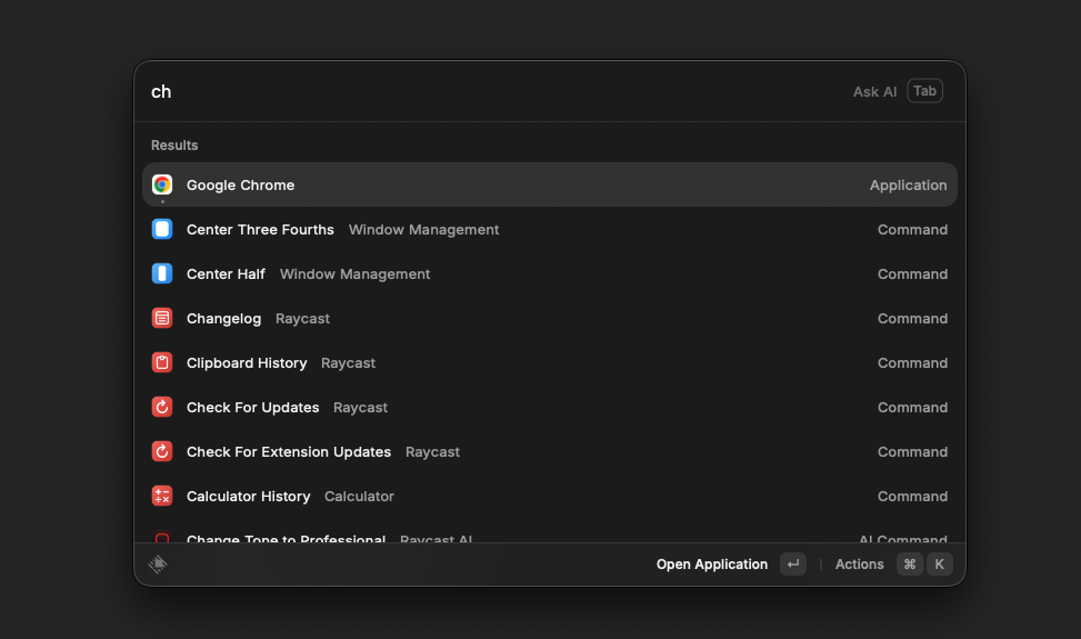 Alt + Space でRaycastを呼び出して、使いたいアプリの名前をタイプするだけ。例えば「chr」と打てばChromeが、「exc」と打てばExcelが、候補に出てきてEnterを押すだけで起動できます。